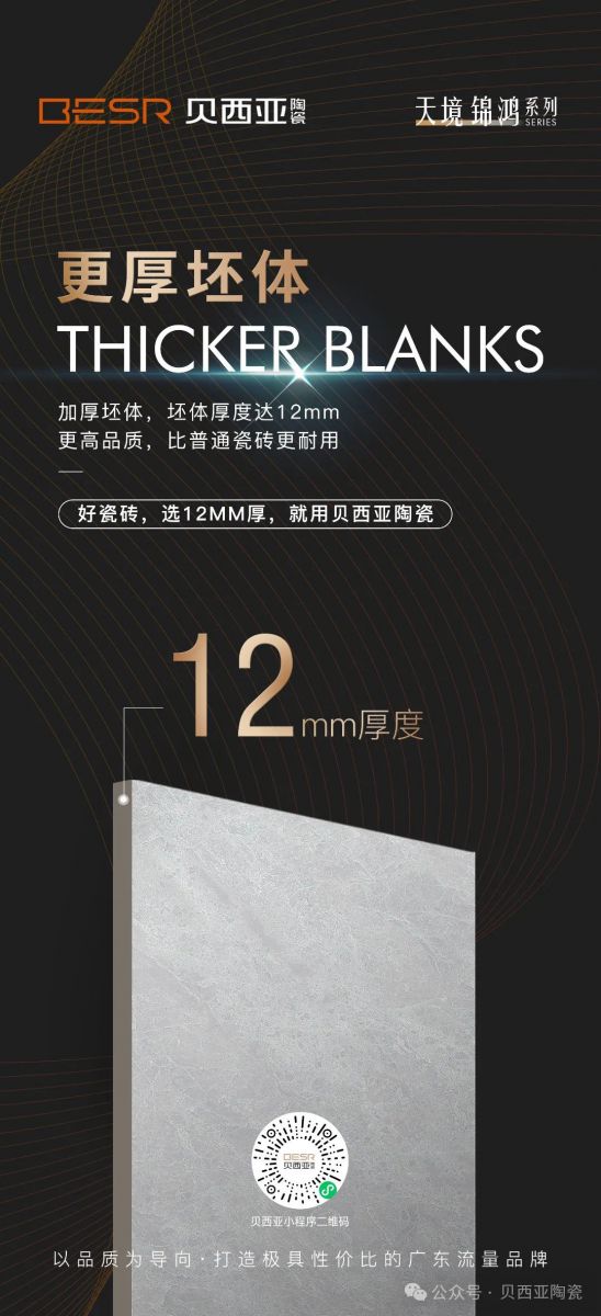更厚坯體:加厚坯體,坯體厚度達12mm,更高品質,比普通瓷磚更耐用。