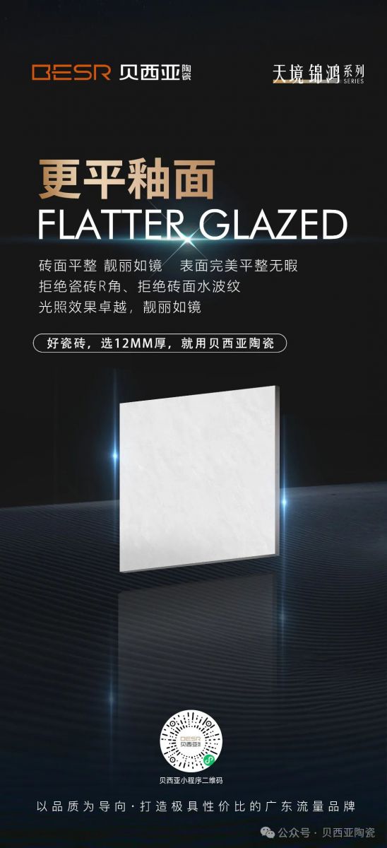 更平釉面:磚面平整 靚麗如鏡,表面完美平整無暇,拒絕R角、拒絕水波紋,光照效果卓越,靚麗如鏡。